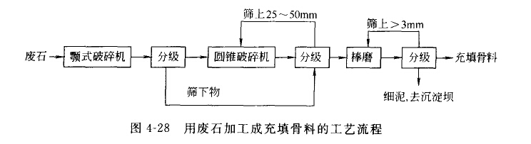 矿山开采过程中剥离及掘进时产生的无工业价值的矿床围岩及夹石成为废石。废石的排放量很大,目前我国度石主要用于生产建筑材 料和办并充填料。无论是作为建筑材料还是作为矿井充填料,都必须将废石破碎到一定的粒度,以满足不同用途的要求。图4—28 所示为以破碎废石作为井下胶结充填月料的工艺流程。