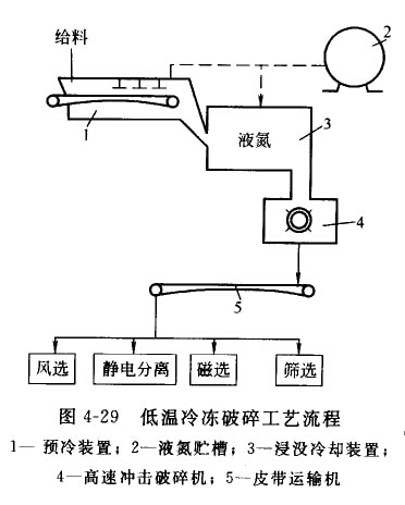 对于一些在常温下难以破碎的固体废物如汽车轮胎、包覆电线、废家用电器等,可以利用其低温变脆的性能而有效地施行破碎,也可 利用不同废物脆化温度的差异进行在低温下选择性破碎。低温破碎通常需要配置制冷系统,液氮是常用的制冷剂,因液氮制冷效果好、 无毒、无爆炸性且货源允足。但是所需的液氮量较大,是制备液氮需要消耗大量的能旦,故出于经济上的考虑,低温破碎对象仅限于常 温下破碎机回收成本高的合成材料,如橡胶和塑料。