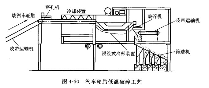 图4—30所示为汽车轮胎低温破碎上艺。经皮带运输机送来的废轮胎采用穿孔机穿孔后,经喷洒式冷却装置预冷,再送涅没式冷 却装置冷却。通过辊式破碎机破碎分离成“橡胶和夹丝布”与“车轮凶缘”两部分,然后送至安合磁选机的皮带 运输机进行磁选。前者经锤碎机二次破碎后送筛选机分离成不同粒度至再生利用工序。