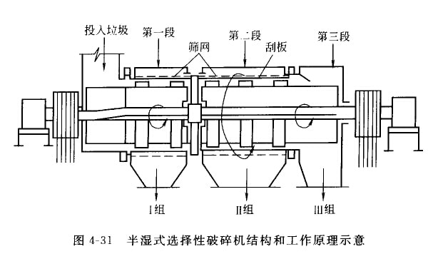 半湿式选挥性破碎分选可把垃圾中有利用价值的各种物质充分问收。因为城市垃圾小各种织分的耐剪切、耐压缩、耐冲击性能差异很 大,例如纸类在适量水分存在时强度降低,玻璃类受冲击时容易破碎成小块,蔬菜类废物耐冲击、耐剪切性能均楚,很容易破碎,根据 这些差异.采用半湿法在特制的具有冲击、剪切作用的装置里,对废物进行选择件破碎,使其变成不同粒径的碎块,然后通过网眼大小 不同的筛网加以分选。