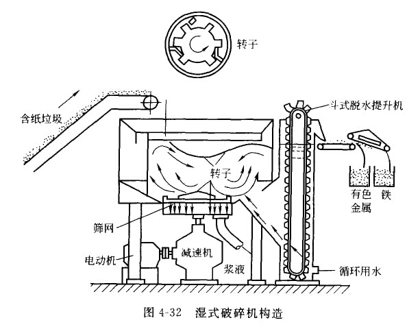湿式破碎机构造如图4—32所示,是在20世纪70年代由美国一家生产造纸设备的BLACK-CLAUSON公司研制完成的。该破碎机为一 圆形立式转筒,底部设有多孔筛。初步分选的垃圾经山传输带投入机内后,靠筛上安装的六只切割叶轮的旋转作用,使废物与大量水流 在同—个水槽内急速旋转、搅拌、破肿成泥浆状。浆体出底部筛几流出,经湿式旋风分离器除去元机物,送到纸浆纤维问收工序进 行洗涤、过筛与脱水。除去纸浆的有机残边可在与4%浓度的城市下水污泥混合,脱水至50%后,送至焚烧炉焚烧,回收热能。破碎机内 木能粉淬和未通过筛板的金届、陶瓷类物质从机内的底部侧口比山,由提升斗送列传输佾,出磁选器进行分离。