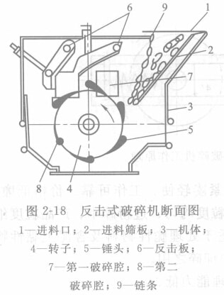 反击式破碎机是一种高效的新型破碎设备。下图为反击式破碎机的断面图。