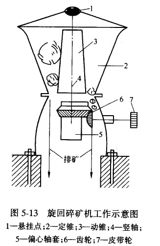 (1)粗碎用圆锥碎矿机。目前应用得最广泛的是悬轴式圆锥碎矿机,这种碎矿机按其排矿方式不同,又可分为侧面排矿和中心排矿两种,前者虽在一些老选矿厂中尚可见到,但目前已不再制造了,而现在应用最为广泛的是中心排矿式圆锥碎办机。