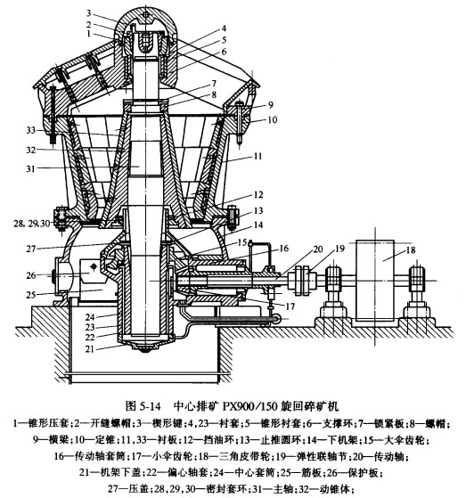 图5-14是我国自制的PX900/150型中心排矿的旋回碎矿机。