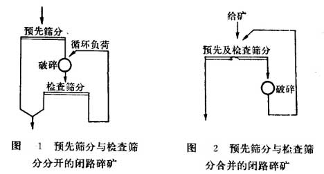 在一个破碎段中,如果没有检查筛分作业则叫开路破碎。如果有检査筛分作业就叫闭路破碎。在同一个破碎段中可以同时有预先筛分作业和检查筛分作业。这两个作业可以是分开进行的如图1,也可以是合并进行的如图2。
