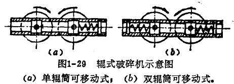 双辊筒的辊式破碎机又可分为单辊可移动式和双辊可移动式两种(图1-29)。辊筒的驱动分单辊驱动(由一个电动机和一套传动系统组成)和双辊驱动(两个辊简分别由两个电动机和两旁传动系统组成)。