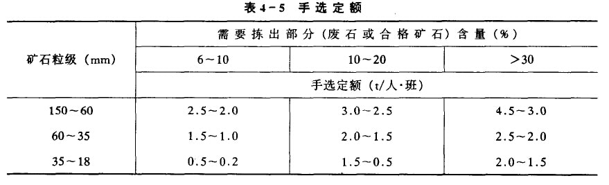 根据江西、广东、湖南等省选矿厂的生产实践统计,皮石选出率为35%一7D%,手选工效约3t/人·班,手选回收率为96.5%一99.0%。手选定额如表4—5所示。
