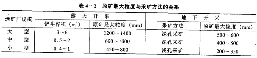 原矿最大耗度的确定:原矿最大粒度与采矿有关,即与矿床赋存条件、矿山规模、采矿方法、装运设备等有关。它们之间的关系,如表4—2所示。