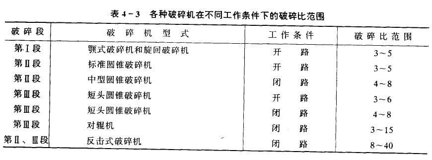 总破碎比等于各段破碎比之乘积。各段破碎比与各段破碎机的型式、流程类型和矿石性质有关:各种破辞扒在不同条件厂,其破碎比范围,如表4—3所示(难碎性矿石取小值、易碎性矿石取大值)。