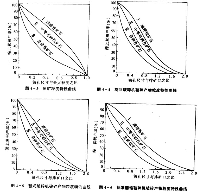 所谓最大粒度,是指95%的矿量通过某一筛孔尺寸的粒度。从表4—2看出.原矿最大粒度范围为200一1400mm。