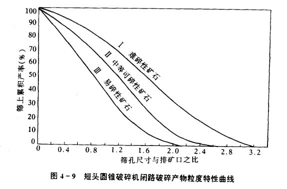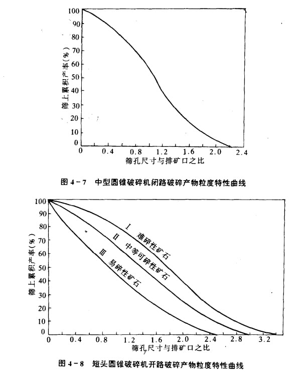 从表4—4可以看出,各种类型的破碎机的排矿产物中都有过大颗粒,而且过大颗粒的含量很高.如短头圆锥破碎机破碎中等可碎性矿石时,排矿产物中过大颗粒含量高达60%,最大粒度为排矿口宽度的2.2—2.7倍;破碎难碎矿石时更为严重,B=75%,Zmm=2.9—3.0。