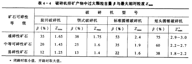 所谓检查筛分是与破碎机(主要是细碎机)构成闭路的筛分作业。各种类型破碎帆不管是开路破碎,还是闭路破碎,其排矿产物中都含有小于排矿口宽度的产物和大于排矿口宽度的产物(或称过大颗粒),如图4—8,图4—9所示。小于排矿口宽度的产物,设置预先筛分是有利的,大于徘矿口宽度的产物,设置检查筛分是必要的。破碎机排矿产物中最大粒度与排矿口宽度之比,称为最大相对粒度。同理.排矿产物中某一粒度(对应于某一筛孔尺寸)与排矿口宽度之比,称为某一相对粒度Z。排矿产物中,大于诽矿口宽度的过大颗粒含量与最大相对粒度,如表4—4所示。