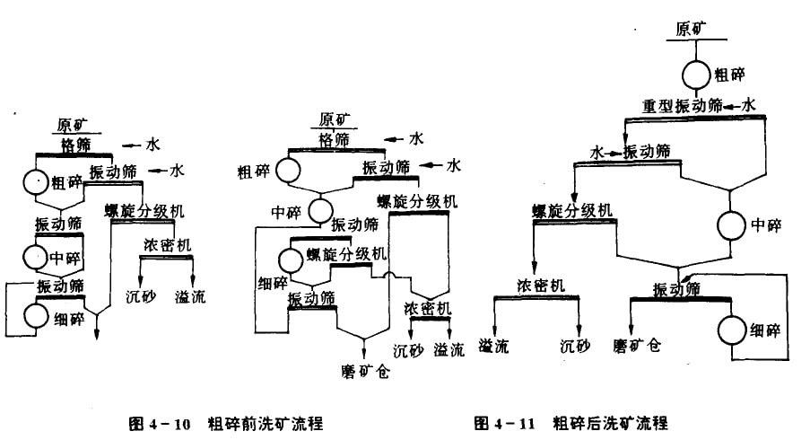 洗矿的典型流程,如图4—Io,图4—ll所示。洗矿后的矿泥有单独处理和矿砂、矿泥合并处理两种方案,采用哪种方案,视矿泥和矿砂的性质而定。