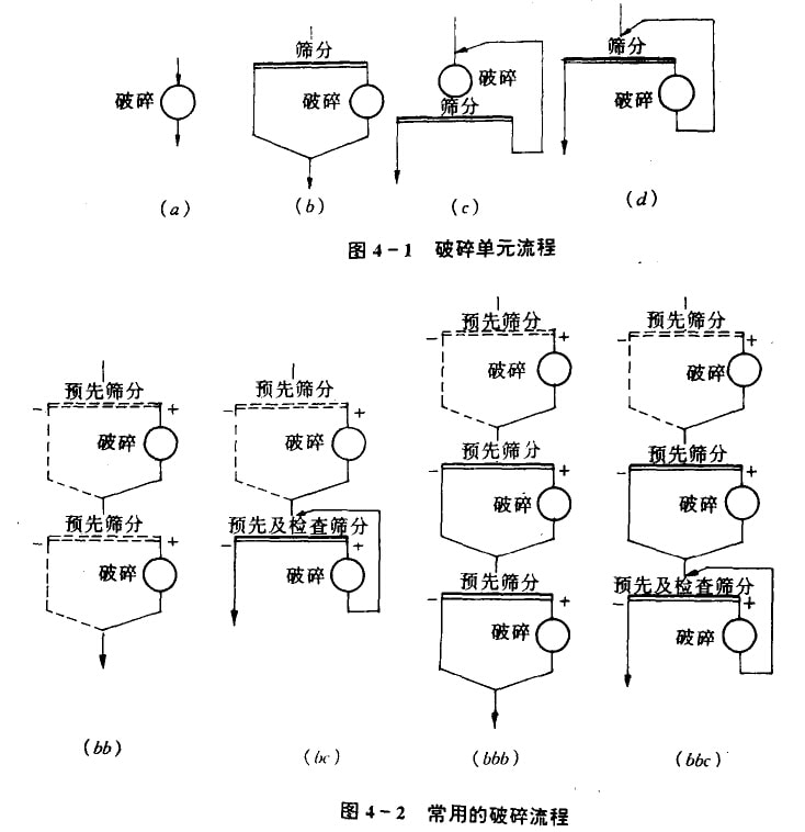 常用破碎流程:破碎流程可能的类型很多,但根据预先筛分,检查筛分设置条件,以及 实际生产中的原矿最大粒度和破碎最终产物粒度,常用的破碎流程有以下四种,如图4—2所示。