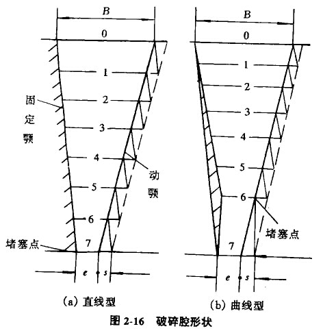 破碎腔形状设计的是否合理,直接影响破碎机的破碎效果、生产率、能量消耗、衬板磨损和破碎比等重要指标。破碎腔形状如图2-16所示,有直线型破碎腔和曲线型破碎腔。实践与理论分析说明曲线型破碎腔优于直线型破碎腔。因此,采用曲线型破碎腔是现代破碎设备结构的发展方向。