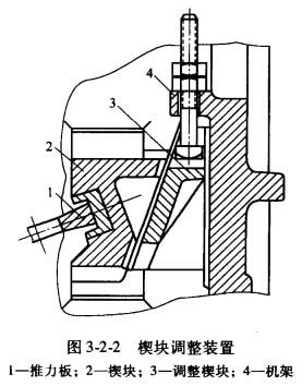 (2)楔块调整。借助后推力板支座与机架后壁之间的两个楔块的相对移动来实现破碎机排矿口的调整(图3-2-2)。转动螺栓上的螺帽,使调整楔块3沿着机架4的后壁做上升或下降移动,带动前楔块2向前或向后移动;从而推动报力板或动领,以达到排矿口调整的目的。此法可以达到无级调整,调整方便,节省时间,不必停车调整,但增加了机器的尺寸和质量。中、小型额式破碎机常常采用这种调整装置。