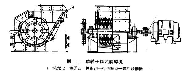 锤式破碎机主要由机壳1,转子2、箅条3和打击板4等部件组成见图1,机完分上下两部分,系钢板焊接件,机壳内壁镶有高锰钢衬板,衬板磨损后可以更换。