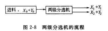两级分选机的流程如图2-8所示。在两级分选机中,给入的物料是由X和Y组成的混合物,X、Y为待分选的物料。单位时间内进入分选机的物料X和物料Y的量分别为Xo和Yo;单位时间内物料X和物料Y从第一排出口排出的量分别为X1和Y1;从第二排出口排出的量分别为X2和Y2。假定要求该二级分选机将物料X选入第一排出口,将物料Y选人第二排出口,如果该分选机效率足够高,那么物料X都通过第一排出口排出,物料Y都通过第二排出口徘出。实际上,从第一排出口排出的物料流中会含有部分物料Y,而从第二排出口中排出的物料流中也会含有部分物料X,因此就存在分选效率的问题。