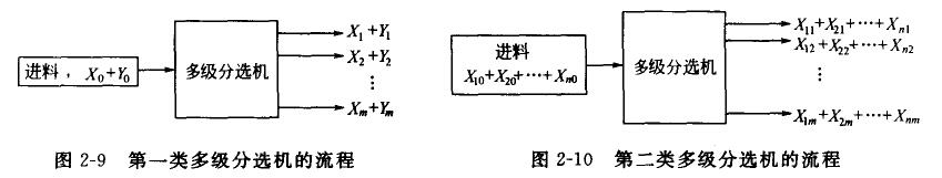 多级分选机可分为两类。第一类多级分选机,其给料中只育X和Y两种物料,分选机有两个以上的排料口,每一排出口中都有物料X和Y,但含量不同,其流程如图2-9所示。