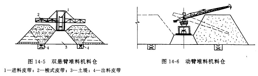 (3)堆料式料仓。堆料机是可以沿轨道移动,有悬臂扩大堆料范围的专用机械。双恳臂堆料机如图14—5所示。动臂堆料机如图14—6所示,动臂可以旋转和仰俯(变幅范围在土16°之间),能适应准料位置和堆料高度的变化,避免骨料跃落过高,产生逊径。
