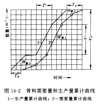 先根据混凝土浇筑计划,绘出骨料需要量累计曲线,然后绘出骨料生产量累计曲线,图14—2所示。