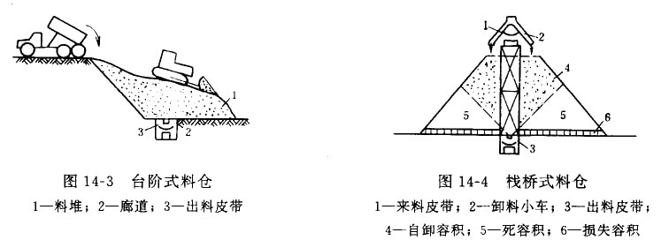 (1)台阶式料仓。如图14—3所示,利用高差地形,将料仓布置在进料线路下方,出汽车或铁路矿车直接卸料。料仓底部设有出料廊道(又称地弄),砂石料通过卸料弧形阀门卸在皮带机上运出。为了扩大堆料容积,可用推土机集料或散料。这种料仓设备简单,但须有合适的地形条件。