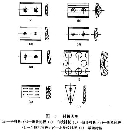 常用衬板的形状见图2,形状较平滑的衬板使钢球同衬板之间的相对滑动较大,产生铰多的研磨作用,在相同转速下钢球被提升的高度和抛射所耗的功较少,适于细磨。凸起部较高的衬板对钢球的推举作用强,使钢球能升至较高的位置,冲击作用较强。橡胶衬板耐磨损(寿命比猛钢材板高2—3倍)重量轻(比锰钢衬板轻约85%)、拆装方便、噪声小。