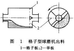 另一种球磨机是在出料端附近有格子板。格子板由若干块扇形板组成,扇形板上有宽度为8—20mm的筛孔,物料可通过筛孔而聚集在格子板与右端盖之间的空间内。此空间内有若干块辐射状的举板。筒体转动时.举板将物料向上提举,物料下落时经过锥形块而向出料端折转,经右端中空轴排出。由于格子板和举板的作用,物料在出料端的料位较低,使排料加快,生产量提高,参见图1。