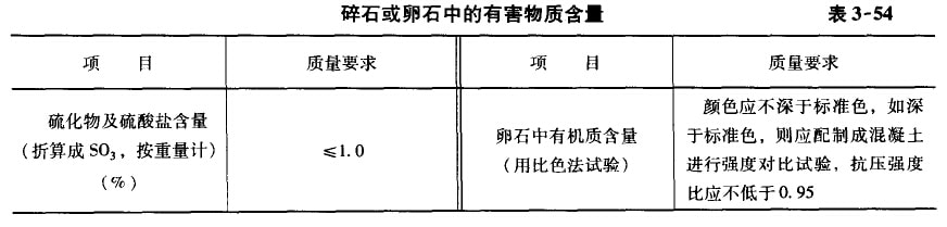 ⑦有害物质含量:碎石或卵石中的硫化物和硫酸盐含量,以及卵石中有机杂质含量,应符合表3-54的规定。