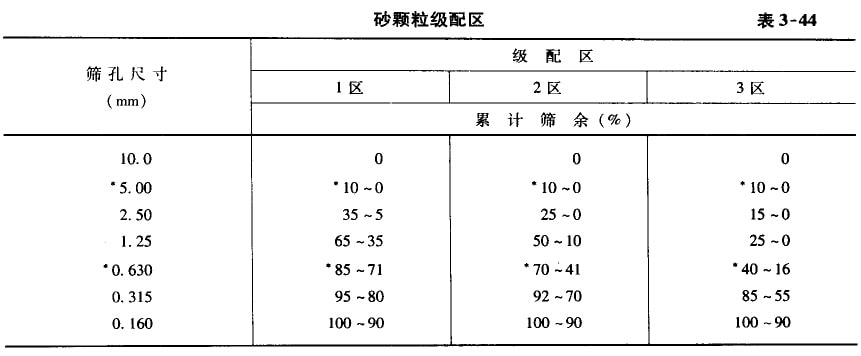 对于细度模数为3.7—1.6的砂,按0.630mm筛孔的累计筛余量(以重量百分率计)分成三个级配区。砂的颗粒级配,应处于表3 -44中的任何一个级配区以内。