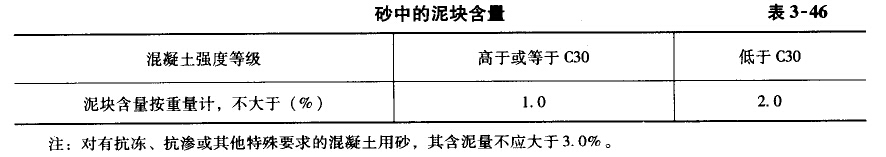 砂中粒径大于1.25mm、经水洗后用手掐变成小于0.63mm的颗粒含量,见表3—46。