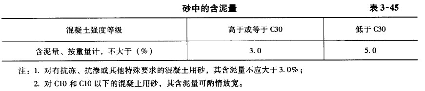 砂的含泥量(即粒径小于0.080mm的尘屑、淤泥和豹土的总含量)应符合表3—45的规定。