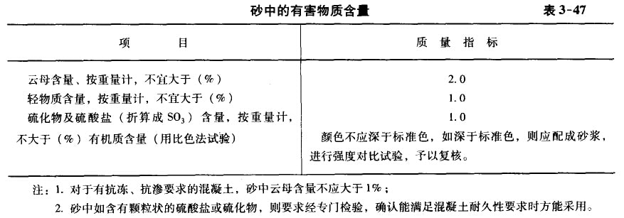 砂中如含有云母、轻物质(表观密度小于2.0,如煤和褐煤等)、有机质、硫化物及硫酸盐等有害质,其含量应符合表3—47的规定。