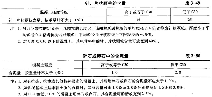 ②针、片状颗粒含量:碎石或卵石中针、片状颗粒含量.应符合表3-49的要求。