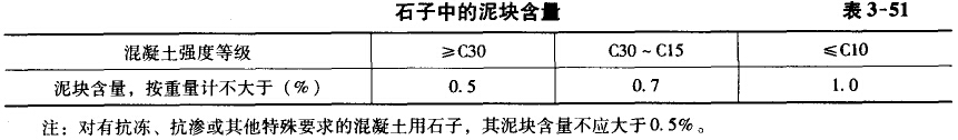④泥块含量:石子中粒径大于1.25mm,经水洗后用手掐变成小于0.63mm的颗粒含量,见表3-51;