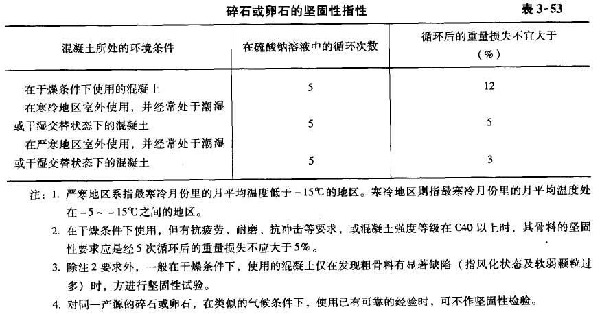 ⑥坚固性:当采用硫酸钠溶液法作坚同性检验时,其指标应符合表3-53的规定。