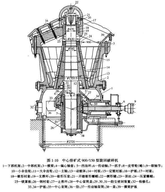 图1—10是国产的900/150型中心排矿式旋回破碎机,它由机架、偏心抽套、主轴和动锥、悬挂装置及传动机构等部分所组成。