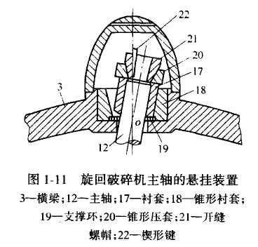 主轴12通过开缝锥形螺帽21、锥形压套20、衬套17和支撑环19悬挂在横梁上,并用楔形键22防止开缝锥形螺帽2l退扣。衬套17的锥形端支承在支撑环19上,而侧面则支承在锥套18上:在破碎机运转时,由于衬套17的下端与锥形衬套18的内表面部是圆锥面,故能保证村套17沿支撑环19利锥形衬套18滚动.从而满足了动锥旋摆运动的要求。
