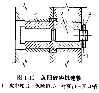 旋回破碎机的保险装置,主要是利用连接传动蚀和三角皮带轮的联细节土的保险销,当过负荷时或破碎机中落人大块非破碎物时(如电铲齿),保险销即被招断,达到保险的日的。其装置如图1—12所示,它由四个保险销组成,装在联轴节上,用以连接传动轴和i角皮带轮。