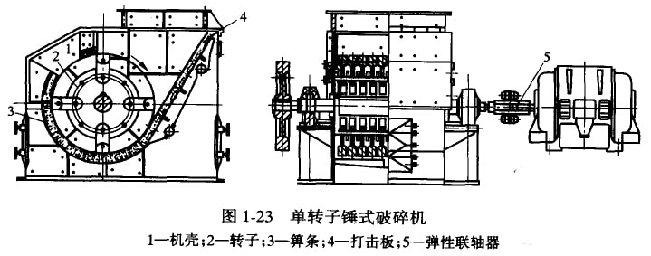 锤式破碎机主要由机壳1,转子2、篦条3和打击板4等部件组成见田1—23,机完分上下两部分,系钢板焊接件,机壳内壁镕有高镭钢衬板,衬板磨损后可以更换。