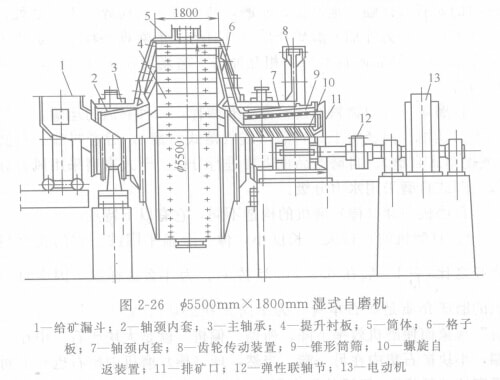 图2-26为φ5500mm×1800mm湿式自磨机构造示意图。