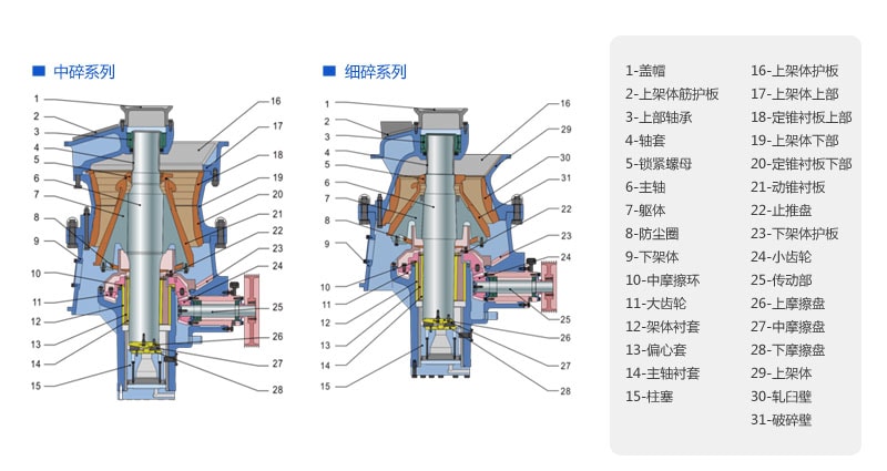 该系列圆锥有中碎和细碎两种机型,每种机型有多种腔型可供选择,还可通过调整偏心距来适应不同的产工艺。通过调整传动轴转速,还可实现对产品级配的调整,从而使设备的价值充分体现。
